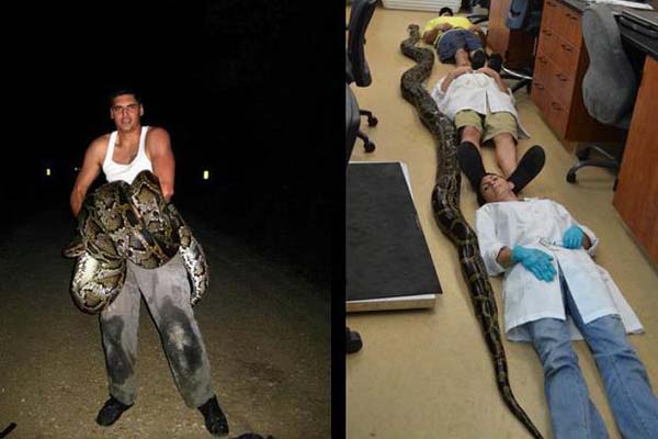 Najpopularniejszym z intruzów jest pyton birmański, węże tego rodzaju mogą osiągnąć 8 metrów długości i ważyć do 200 funtów. Taki potwór może z łatwością upolować zwierzę wielkości jelenia i sporą odwagą popisał się ostatnio mieszkaniec Miami, Jason Leon, który jadąc nocą samochodem przez powiat Dade zauważył takiego osobnika w przydrożnych krzakach. Próba wyciągnięcia giganta na drogę skończyła się walką na śmierć i życie z użyciem przez Leona noża, gdyż pyton owinął się wokół jego nogi. Jak się okazało, zabite zwierzę było naprawdę okazałe, miało 5,7 metra długości, czyli 30 cm więcej niż dotychczasowy największy zabity na wolności pyton birmański.