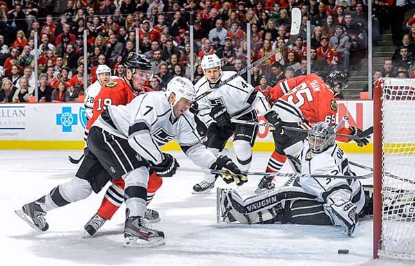 Powyższe czynniki nieco przygasiły wcześniejszy hurraoptymizm, jaki panował w całym Chicagolandzie. Nastroje przed konfrontacją z aktualnymi jeszcze mistrzami NHL były więc – powiedzmy – umiarkowanie optymistyczne. Szczególnie dlatego, iż aktualni podopieczni najpierw gracza a później pierwszego szkoleniowca Blackhawks Darryla Suttera, czyli Kings z “Miasta Aniołów”, jakby nabierali wiatru w żagle, prezentując z każdym kolejnym meczem zwyżkę formy. Obawy jednak skończyły się praktycznie już po pierwszych minutach spotkania numer 1 w United Center, kiedy to widać jak na dłoni było, iż “Jastrzębie” startują do wysokiego lotu. Quenneville wręcz genialnie nastawił swoich zawodników od strony taktycznej, chyba absolutnie zaskakując tak Suttera, jak i jego graczy. Kibice podziwiali kapitalną grę Hawks, z kolei rywale z Los Angeles jakby byli zmrożeni… agresywnością gospodarzy. Wszak do tej pory to oni niszczyli fizycznie kolejnych rywali preferując ostrą grę i wręcz zajeżdżając oponentów. A tu szok: znani z efektownej ale raczej miękkiej gry chicagowianie zaatakowali ich bronią. Jak bardzo plan taktyczny pierwszego szkoleniowca “Jastrzębi” sparaliżował w 1. tercji “Króli” niech świadczy stosunek strzałów na bramkę: 17-2 na korzyść Hawks!!! Coś takiego na tym etapie rogrywek się nie zdarza. Tercji notabene przegranej przez nasz zespół 0-1 (gol po fatalym zagraniu Corey’a Crawforda, potem już spisującego się bez zarzutu).