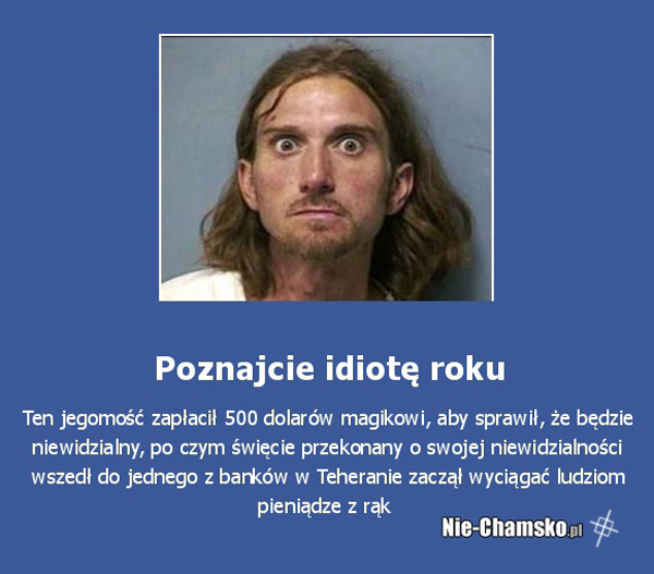 W Georgii złodziejka założyła na głowę plastikowy kontener od mleka. Na nagraniu faktycznie nie można było jej rozpoznać – do chwili, gdy zdjęła zasłonę, bo pracownicy banku mimo powtarzania nie mogli zrozumieć jej żądań. Listę napastników-idiotów zamyka „mistrz”, który przed napadem zawiązał sobie na głowie zbyt małą kuchenną ścierkę. A na dodatek odwrotnie – zasłaniała mu włosy a nie twarz.