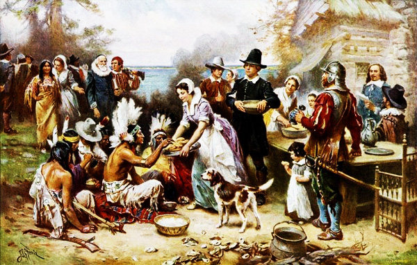 Na ucztę zaproszono zaprzyjaźnionych Indian. Wódz czerwonoskórych przyjął zaproszenie i w wyznaczonym dniu przybył na uroczystość z 90 wojownikami. Jako prezent przyniesiono upolowane jelenie i indyki. Ucztowano pod gołym niebem. Pachniało dziczyzną i suszonymi owocami. Podano także wino sporządzone z dzikich winogron. Rozpalono ogniska. Uczta trwała trzy dni. Zjadano wszystko z ogromnym apetytem. Znikały ze stołów pieczone indyki i ryby. Nie gardzono także fasolą. Smakowały suszone śliwki i jagody, a nawet rukiew wodna. Chleb kukurydziany pasował do wszystkiego. Wspólnej zabawie nie było końca. Indianie demonstrowali białym łuki, osadnicy szczycili się bronią palną. Ćwiczono zapasy i wyścigi biegaczy. Panowała świąteczna atmosfera. Tak wyglądał pierwszy w historii Ameryki Thanksgiving.
