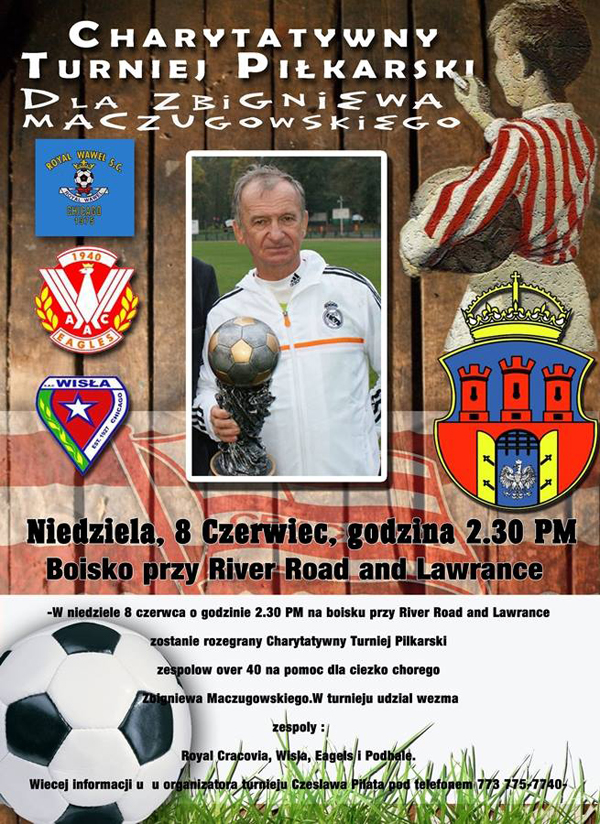 W niedzielę, 8 czerwca, o godzinie 2.30 PM na boisku przy River Road i Lawrance zostanie rozegrany Charytatywny Turniej Piłkarski zespołów over 40, z którego dochód będzie przeznaczony na pomoc dla ciężko chorego Zbigniewa Maczugowskiego.