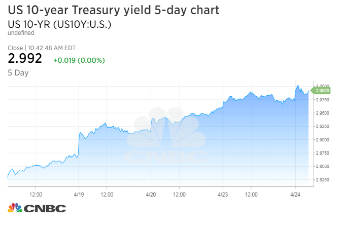 W takich okolicznościach wczorajsze spadki na nowojorskich parkietach w żaden sposób nie powinny być zaskoczeniem. Dow Jones spadł o ponad 400 punktów, obniżając się o 1,74 proc. S&P500 stracił 1,34 proc., zaliczając czwartą z rzędu sesję pod kreską. Nasdaq po utracie 1,7 proc. zatrzymał się tuż ponad pułapem 7 000 punktów. Złe wieści dochodziły też ze spółek – w USA trwa właśnie sezon publikacji raportów za pierwszy kwartał. Po ujawnieniu wyników kwartalnych akcje Alphabet (dawny Google) przeceniono o 4,5 proc. Rosnące koszty i spadek marży okazały się istotniejsze niż wyższy od prognoz zysk na akcję. O 6,2 proc. przeceniono walory Caterpillara, który ostrzegł przed negatywnym wpływem rosnących cen stali. Rynek o blisko 7 proc. przecenił papiery przemysłowego konglomeratu 3M po tym, jak firma obniżyła tegoroczną prognozę zysku. Mamy więc klasyczny obraz nadchodzącego końca cyklicznej hossy na rynku akcji. Po pierwsze, pojawia się alternatywa w postaci wyżej oprocentowanych obligacji. Po drugie, ze względu na rosnące koszty (droższe surowce, cła, wyższe płace) spółkom coraz trudniej poprawiać jest wyniki finansowe. A w wycenach akcji wkalkulowane są oczekiwania na przynajmniej kilkunastoprocentowy wzrost EPS-u (tj. zysku na akcję). To niemal wzorcowy przepis na giełdową bessę.